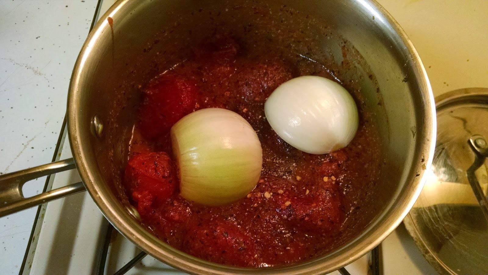 After a minute or so on the stove top, add in the tomatoes and the rest of the ingredients. Stir together. The onion is there to impart some flavor and sweetness. Now put in the oven for 2 hours or so.